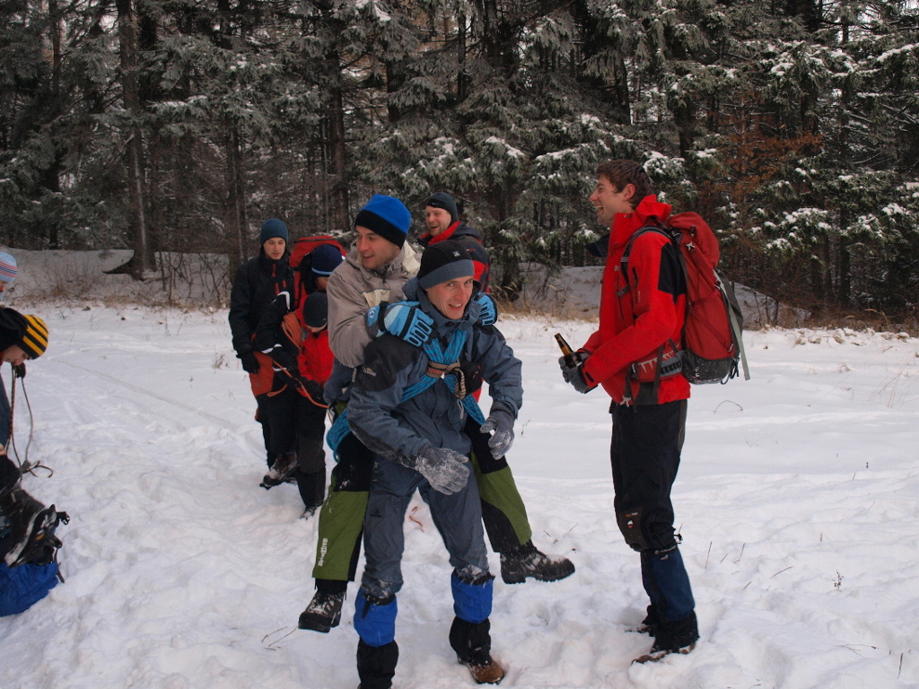 Další den ráno byla Červíkova přednáška o rizicích při plánování výletů v horách. Přednáška byla velice poutavá, tak nevím, jak je možné, že si někteří dovolili během ní usnout (měli by dostat poznámku!). Po teorii jsme si mohli v praxi vyzkoušet vytvoření nosítek z lana, z batohu či teleskopických holí. To nás opravdu bavilo a byla u toho sranda. Samozřejmě jsme si museli transport zraněného vyzkoušet i v terénu a proto jsme vyrazili na menší „transportní“ výlet.