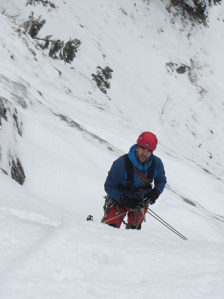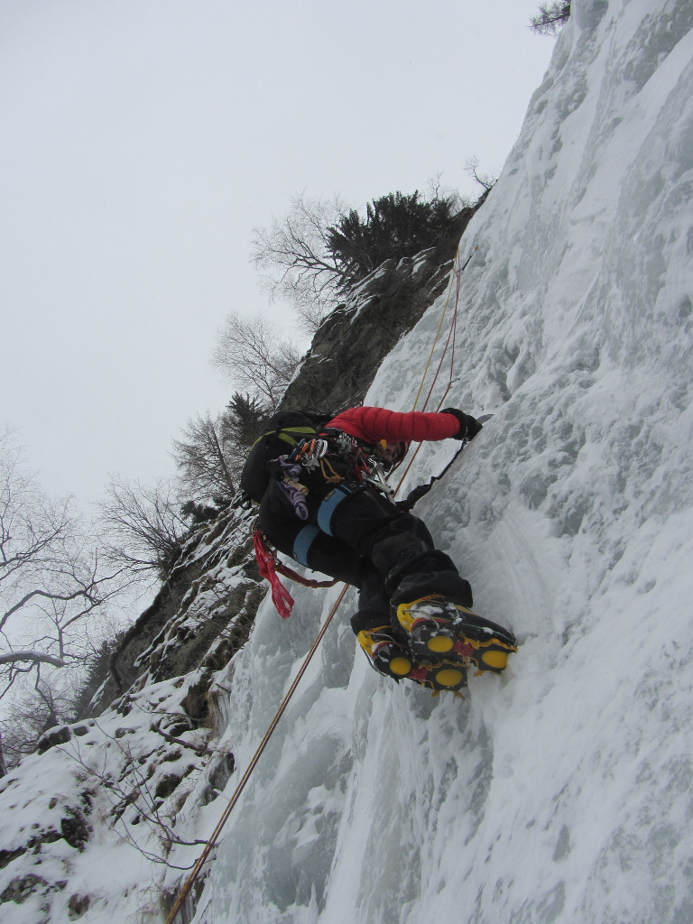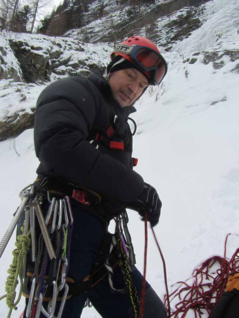 Po chvíli se srovnám a konstatuju, že se můžu hýbat. Vytáhnu si cepíny a začnu stoupat k nejbližší trubce, Gazi dobírá úplně nakrátko. Protože jsem dávat jištění na střídačku, stačí dolézt asi 8 m k nejbližšímu jištění. Dělám štand a nechávám se spustil ke Gazi. Kluci jsou zrovna u ní na štandu a kontrolují mně pozadí. Vypadá to na pěknou díru v pravé hýždi. Přehodnocujeme situaci, uděláme slaňák a už jedeme dolů. Kluci využijí naše jištění a pokračují dál s tím, že sesbírají jištění.