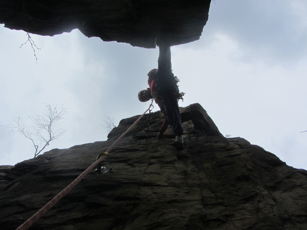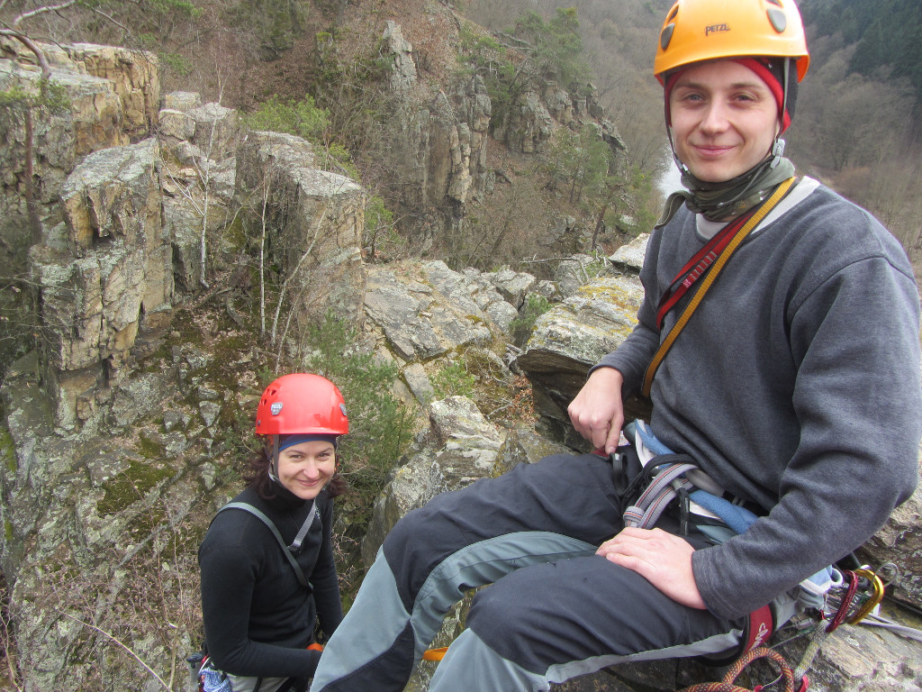 Rozdělili jsme se do dvojic Gazi s Jára a Pája s Peťou. Gazi a Jarda bušili jednu cestu za druhou. Za zmínku stojí obzvláště cesta Kruhová, kde Jarda ukázal velký kus odvahy, protože byla poměrně spoře zajištěná a Jarda se musel hodně ohánět svými friendy. Gazi se zarputilostí jí vlastní Jardu následovala do každé cesty a i s permanentním 9 kilovým batohem byla Járovi rovnocenným spolulezcem. Pro Peťu se jednalo o první větší zkušenosti s lezením venku, proto jsme se nejprve věnovali teorii o zakládání vlastního jištění, dělání štandů a podobných témat, které na stěně člověk sice může zkoušet, ale venku je to stejně vždycky jiné. Poté se druhá dvojka vydala dohánět náskok Gazi s Járou. Peťa se ukázala jako velmi učenlivá lezkyně, všechny cesty byly dobře zajištěné a štandy příkladně zbudované.
